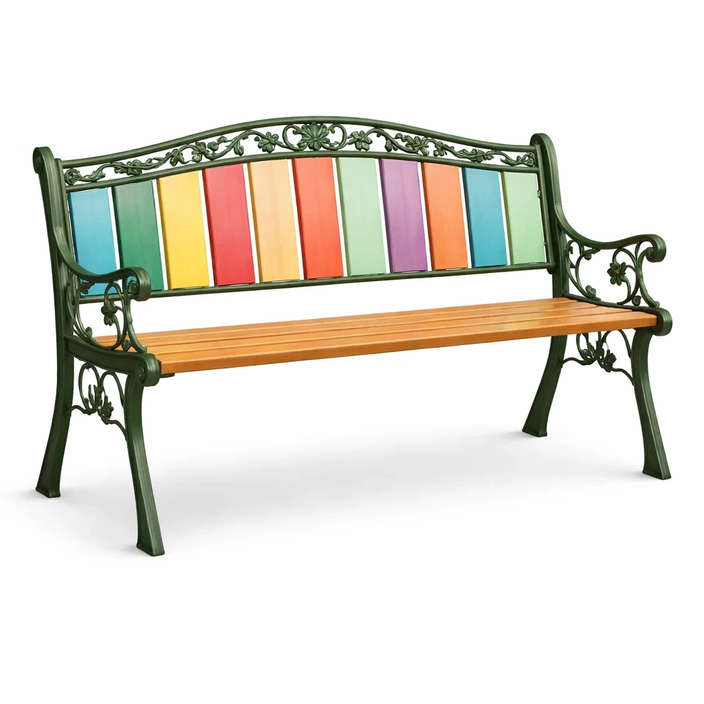 Material:- Rahmen: Gusseisen- Sitzfläche: Massivholz- Rückenlehne: lackiertes Holz in Mehrfarben