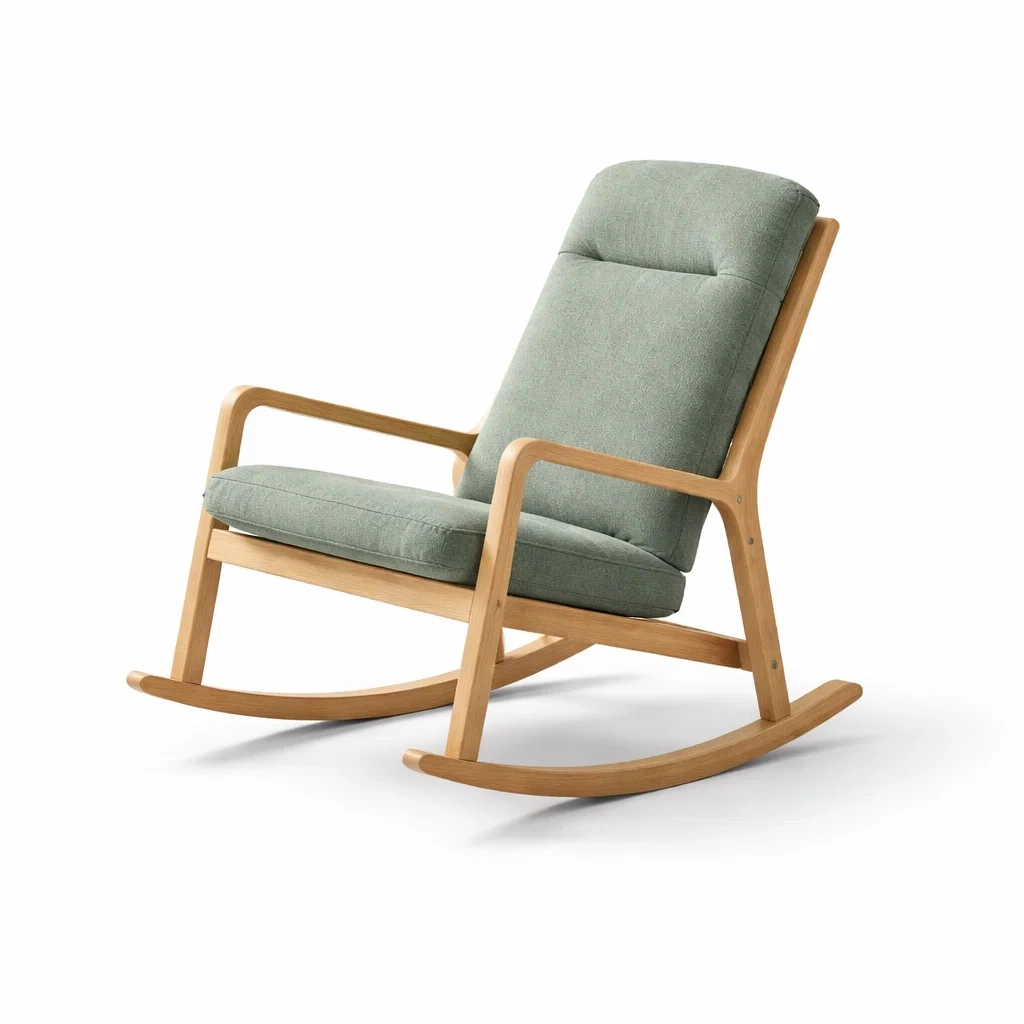Der Schaukelstuhl besteht aus einem robusten Holzrahmen und Kissen aus grünem Leinen. Die Kissen sind mit Schaumstoff gefüllt.